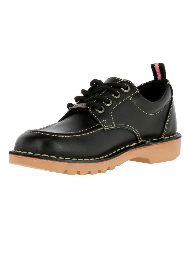 Zapato 100% cuero negro de grosor 1.4mm-1.6mm lo que da durabilidad y resistencia. Su suela de TPR posee costuras 360° y dientes para una adhesión inigualable. Tiene además cuatro líneas de cordones especiales que ayudan a mantener el nudo por más tiempo e ideales para conseguir un ajuste perfecto. Su diseño clásico y simple es indispensable para el colegio. Posee elementos reflectantes 3M.